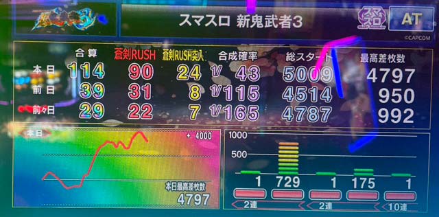そんな新鬼武者シリーズの最新作がスマスロでいよいよ登場したわけだ。どうにかして高設定を早めに打ってみたいという欲に駆られて、導入週の特日に単品の高設定狙いを試みる。