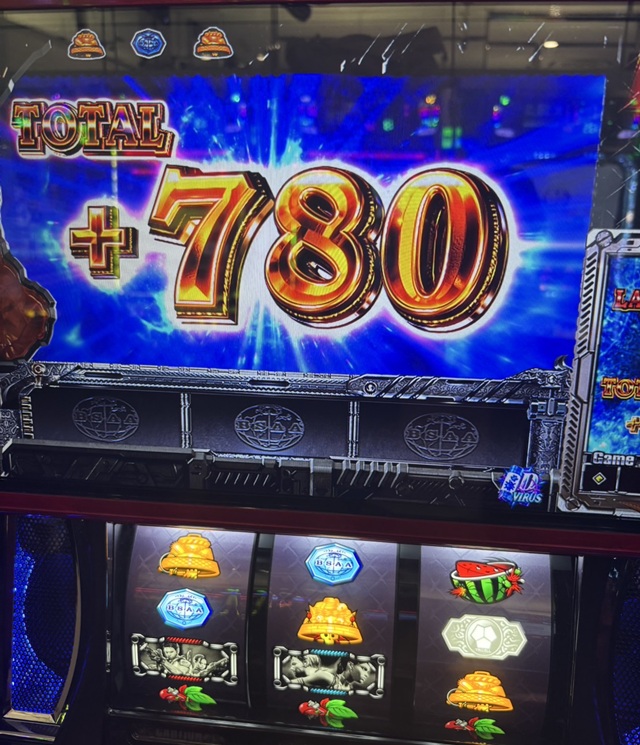 全台系狙いなので周りの台の挙動も大事…なのだが、シマの朝の初当りが妙に重い。ちょっと不安かもと思っていたところで、私の台がいきなり