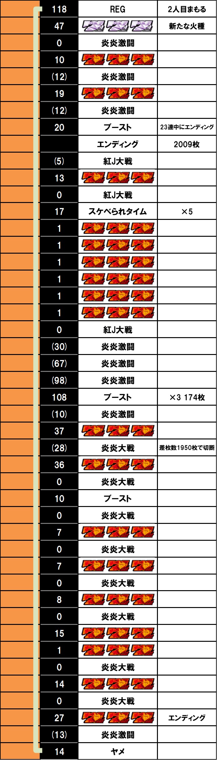 通常なら15Gほどで出て来る炎炎激闘が28G経ってようやく当選。いや前兆長くね?と思っていたらば、出て来たのは上位のSTである炎炎大戦。ここで切断していた模様。ボーナスストック無しの状態だと+1950枚あたりで切るみたいです。