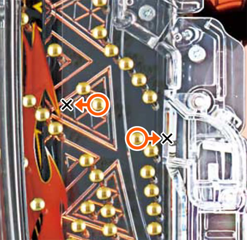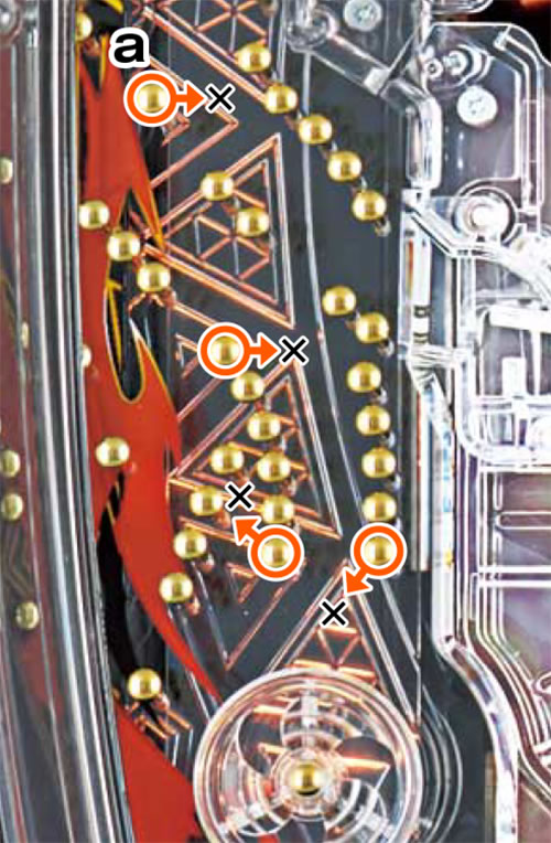 a釘の振り分けで玉が左に向かうと角度的にカラめの2つのこぼしに絡んでしまう。風車上含めややこぼれやすいのでノーマル状態以上が好ましい。