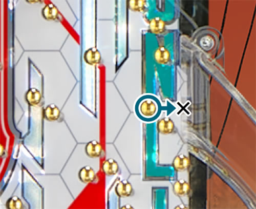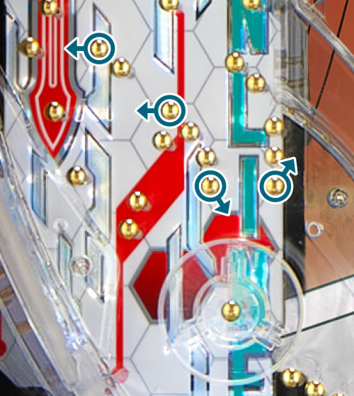 ヘソ付近のサイズも道釘の角度もカラめ。さらに1個戻し。脇の賞球口によく入るなどイレギュラー要素がない限りはハッキリとしたプラス状態が必要。