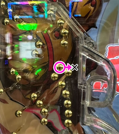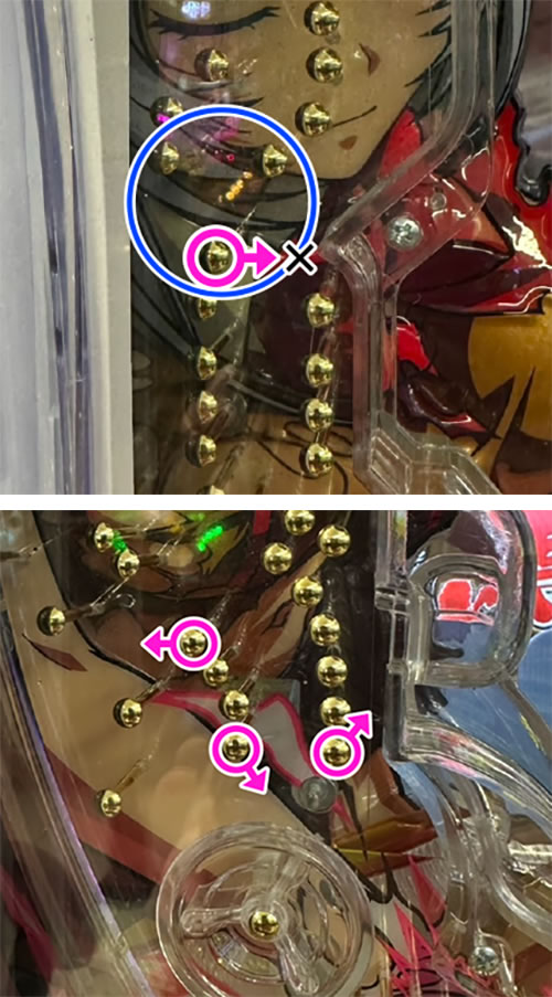 〇で囲んだ部分の分岐で玉が左に行くと脇のこぼしに絡む上にワープに絡まない。まあないとは思うがここのマイナス状態に注意。脇のこぼし・風車上もヘソ付近がカラいのでマイナス状態など論外。