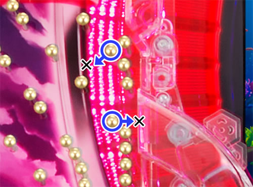 サイズはごく普通だが、海物語シリーズ伝統のアマさはない。道釘の角度もわずかにゆるめ(測りミスの可能性もあるが)。ステージからの入賞が多くない限り、わりとハッキリとしたプラス状態が望ましいところだ。