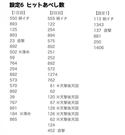 し『うん。ちなみにこれが前日と今回2日間の初当たりあべしデータ。それとオマケして深夜に自身が取った設定1あべしデータ』