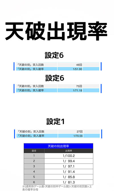 担『やはり設定6、共に天破出現率が高い…と思ったら、設定1での出現率も1/70.56と設定6の1/80.1より上回ってしまっていますね(笑)』