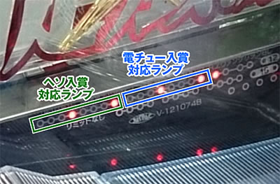 本機の通常時はヘソ・電チューを交互に抽選しているが通常大当り濃厚のランプパターンはヘソ・電チュー共通。大当りしていない側のランプは上記画像のハズレパターンランプ(左から4個目・8個目のランプが点灯)が点灯しているので、そちらではないランプパターンを入力しよう。