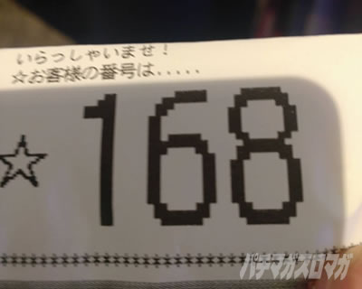 そしていよいよ実戦当日、最初に訪れたのは下見した中で日付的に期待できそうな店舗。ざっと見たところ100人程度の並びの中引いた番号は明らかにそんなに居ないだろっ! てレベルの番号。