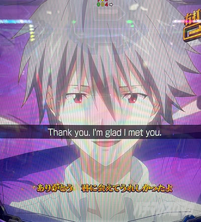 このときのボタンの色がキャラのフレームの色に対応しており、画像の濃い青ならカヲル、紫になったらシンジ、赤ならアスカといった具合です。友達と並び打ちしてキャラ当てクイズも楽しめそうですね。