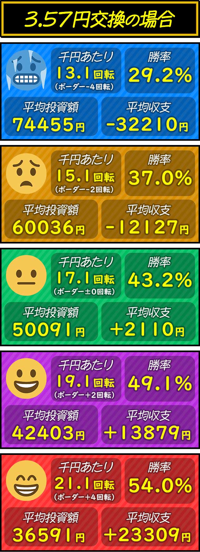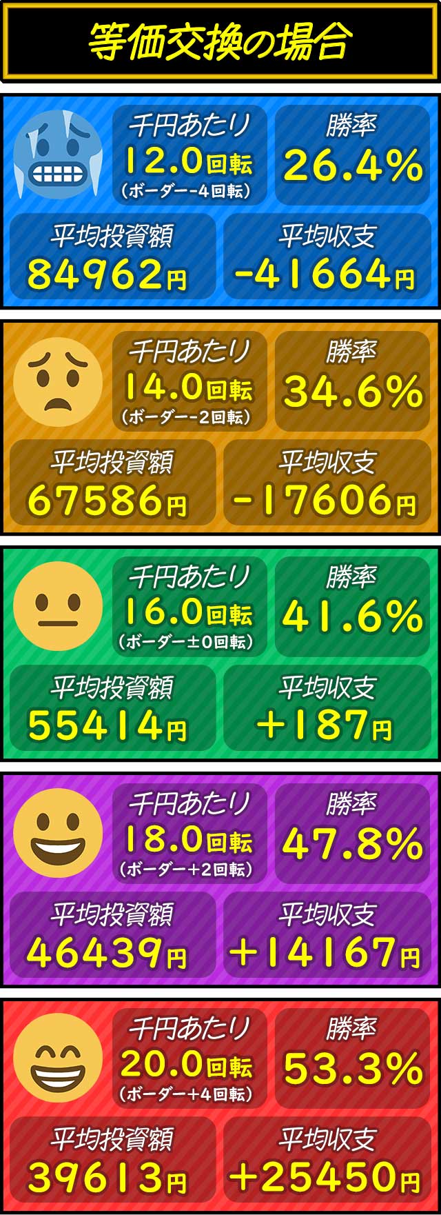 各交換率ごとにボーダー-4〜+4回転を5段階で分けた平均投資額・平均収支・平均勝率を紹介。打つ際の目安として参考にしてもらいたい。