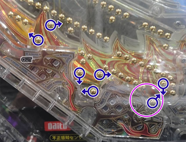 こぼしポイントは数か所あるが、かなり親切な設計となっているのでさほど気にする必要はない。ただし、右打ち中に少しでも玉を減らしたくない方は写真部分をチェックすると良いだろう。