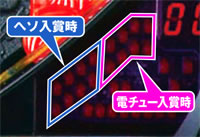 で囲んだランプパターンが「ヘソ入賞時」。ランプの個数が多く、見づらい位置にあるので判別は正確に行おう。