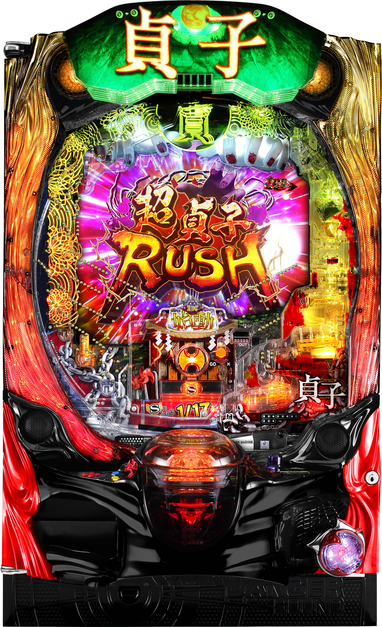 ◆大当りの約60%で突入する超貞子RUSH中の当選確率は約1/77.0(※1)で、継続率は約73%、RUSH中大当り時の約50%で出玉のトリガーとなる極最恐BONUSへ突入!!