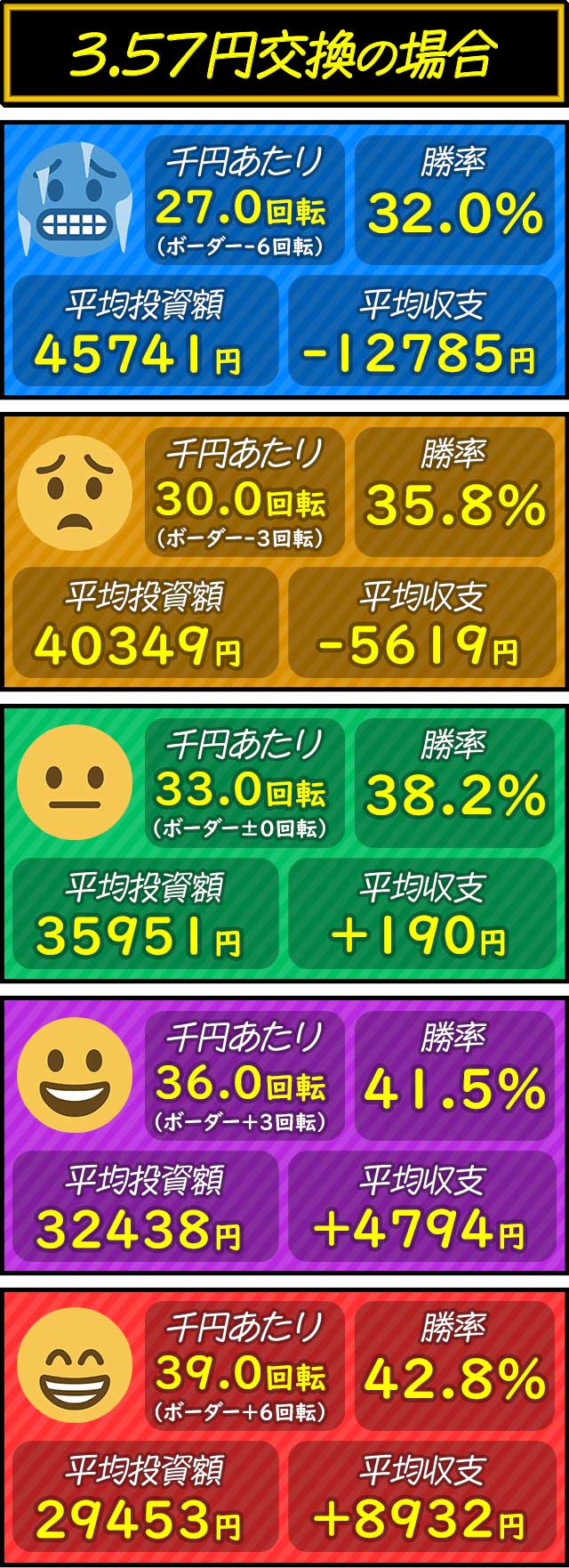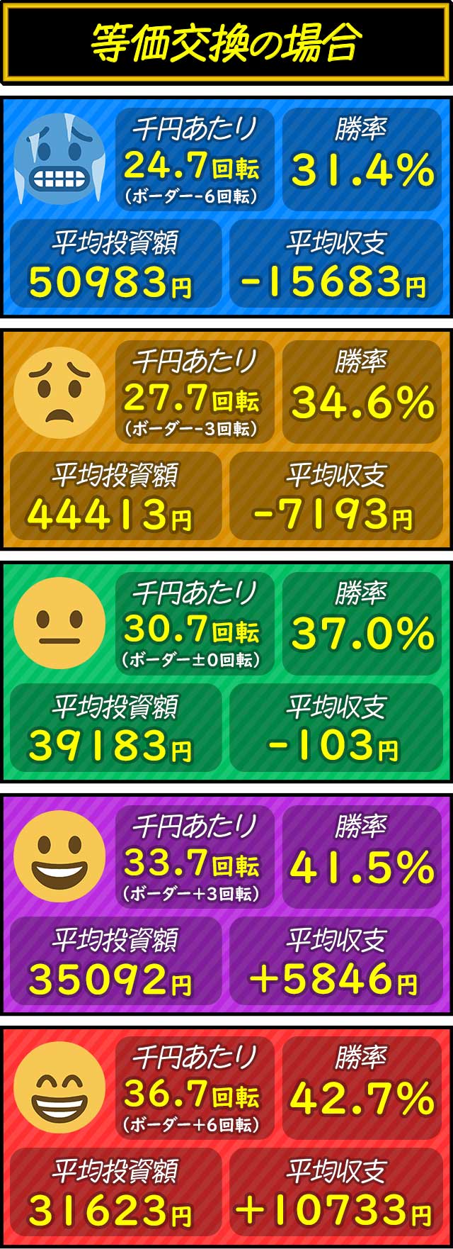 各交換率ごとにボーダー-6〜+6回転を5段階で分けた平均投資額・平均収支・平均勝率を紹介。打つ際の目安として参考にしてもらいたい。