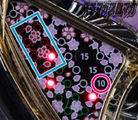 で囲まれた部分。確変判別時はここに表示されたパターンをツールに入力しよう。また、通常時のモード移行の際には10Rランプ(