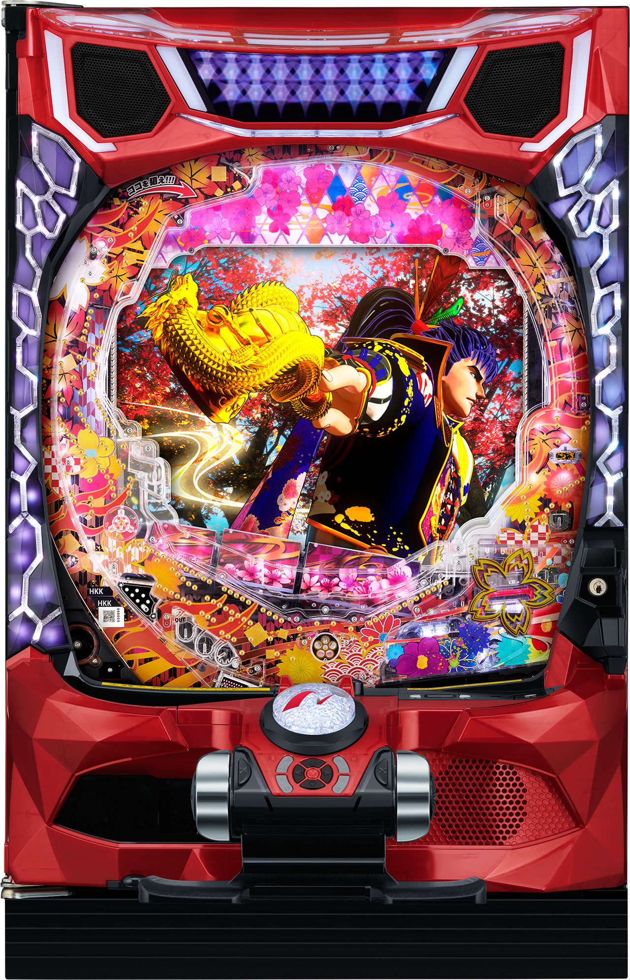 ◆新筐体「リブースト」は操作性抜群のセンターハンドル! 他にも慶次初の「エアー告知」が搭載されている。一方で、天激ボタンがなくなるなど非常にスマートな筐体となった!!