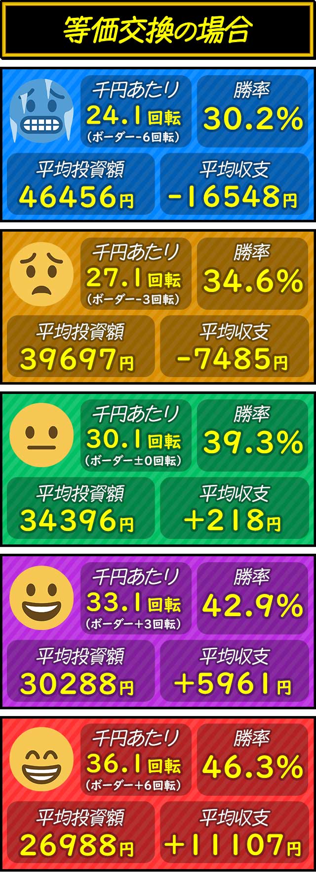 各交換率ごとにボーダー-6〜+6回転を5段階で分けた平均投資額・平均収支・平均勝率を紹介。打つ際の目安として参考にしてもらいたい。
