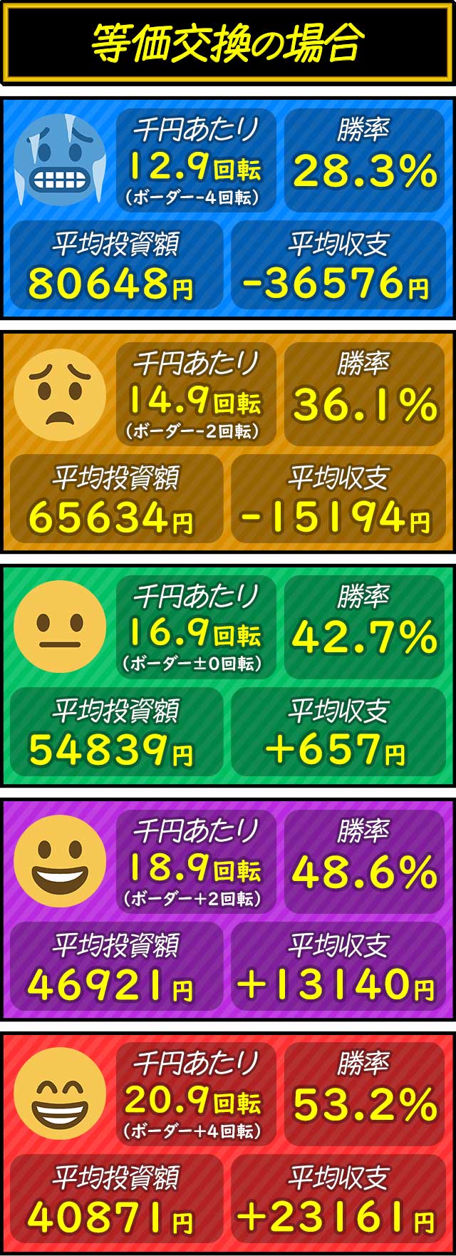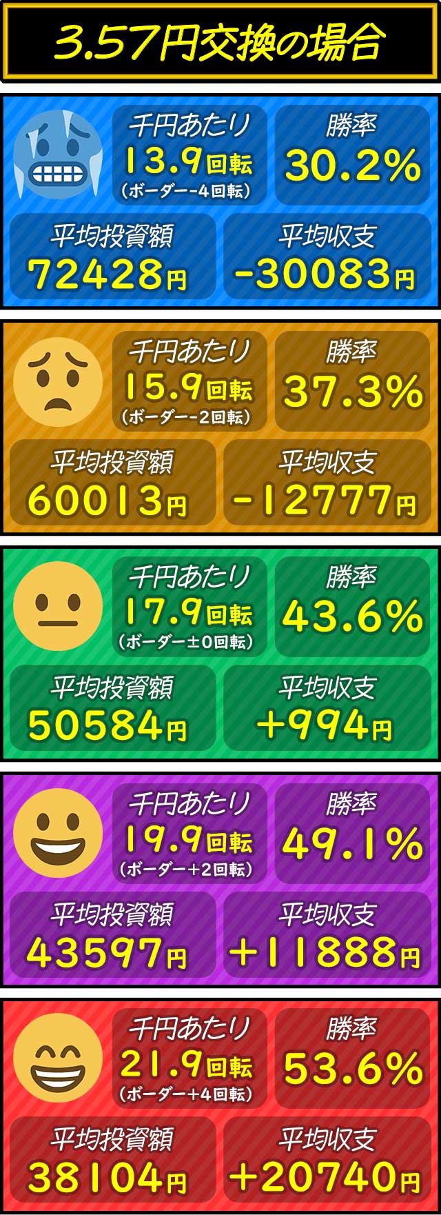 各交換率ごとにボーダー-4〜+4回転を5段階で分けた平均投資額・平均収支・平均勝率を紹介。打つ際の目安として参考にしてもらいたい。
