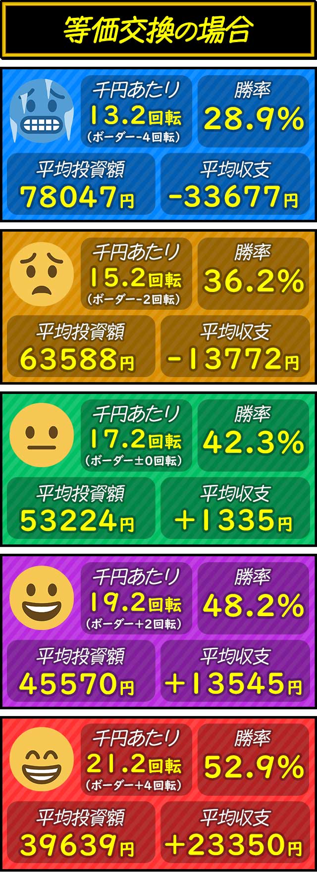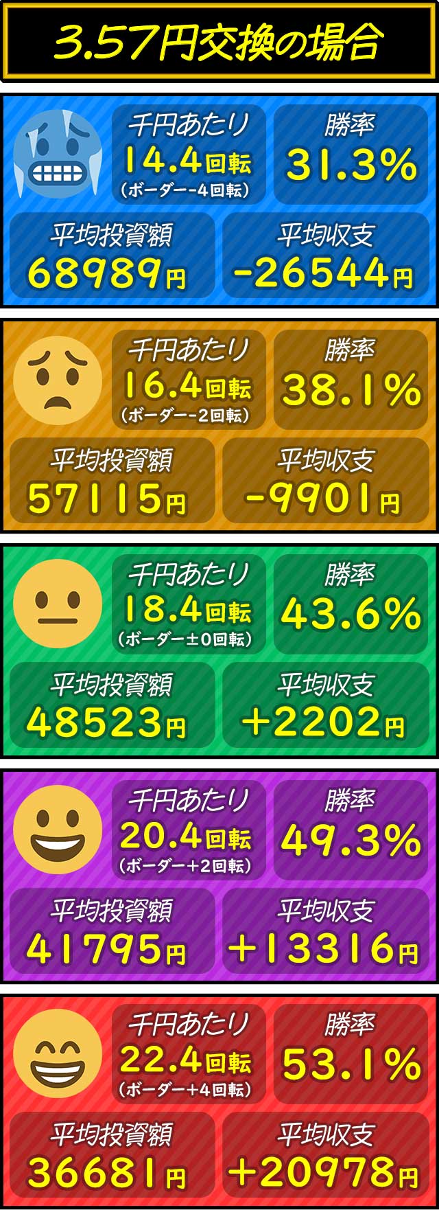 各交換率ごとにボーダー-4〜+4回転を5段階で分けた平均投資額・平均収支・平均勝率を紹介。打つ際の目安として参考にしてもらいたい。