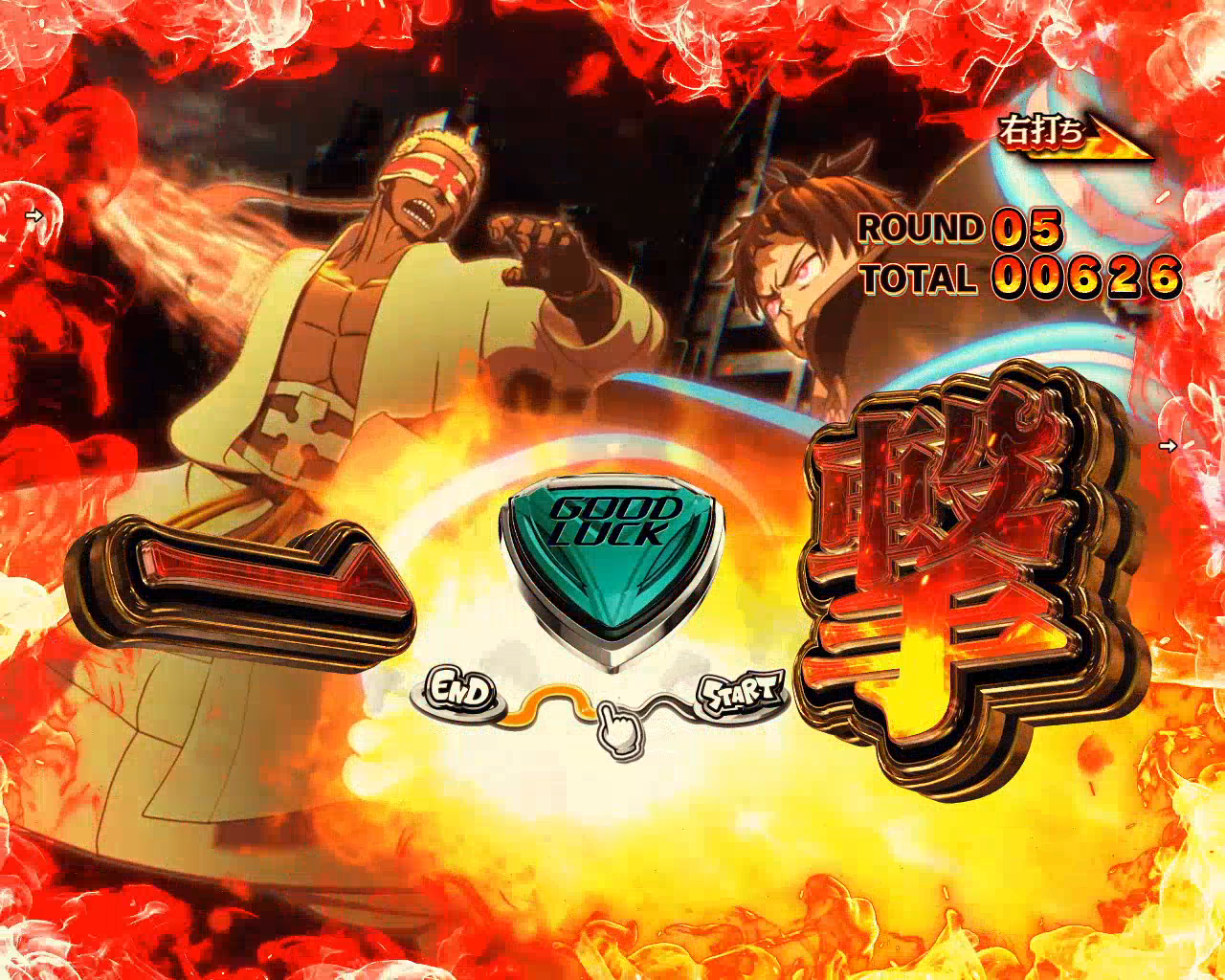今回も通常時の小当りを回収可能。演出成功でSP濃厚となる「火事場の馬鹿力」演出失敗時はアタッカーが一瞬開放されるので積極的に狙っておこう。画面がアーサーとシンラに切り替わってから2〜3個目くらいに飛んだ玉がアタッカーに拾われるが、eフリーダム枠はハンドル入力から玉が飛ぶまでに数秒のタイムラグがあるため上記のタイミングで打ち出しを開始したらちょうどくらいになる。反応速度には個人差、個体差があるので上記を軸に細かいタイミングを調整しよう。