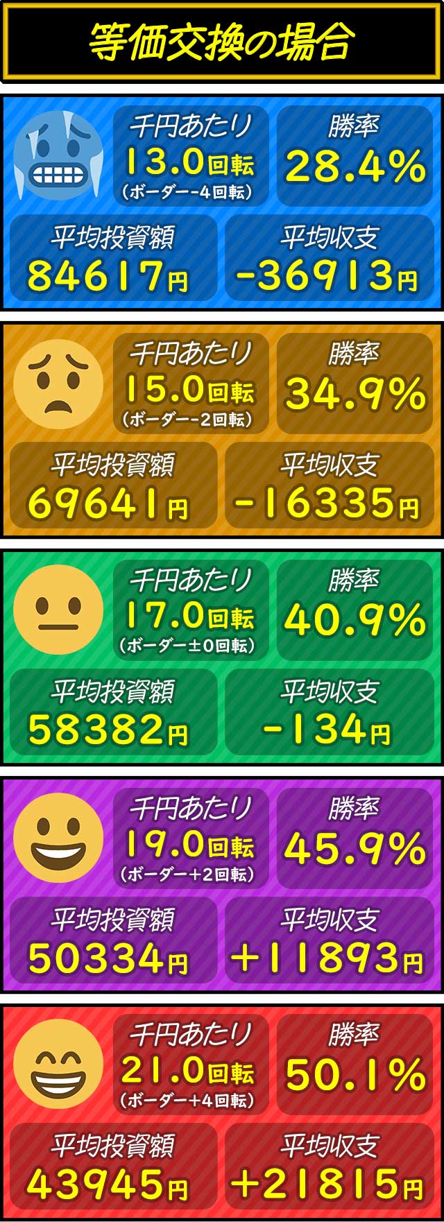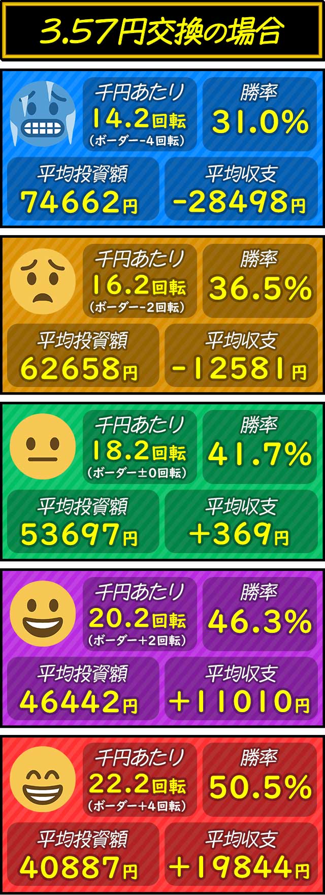 各交換率ごとにボーダー-4〜+4回転を5段階で分けた平均投資額・平均収支・平均勝率を紹介。打つ際の目安として参考にしてもらいたい。