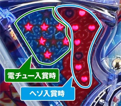 左側の星型ランプ(8個)が電チュー入賞時、右側のハート型のランプ(8個)がヘソ入賞時となる。非常に見づらいので、判別の際は携帯カメラで撮影したり、メモを取るなどして正確な判別を心がけよう。