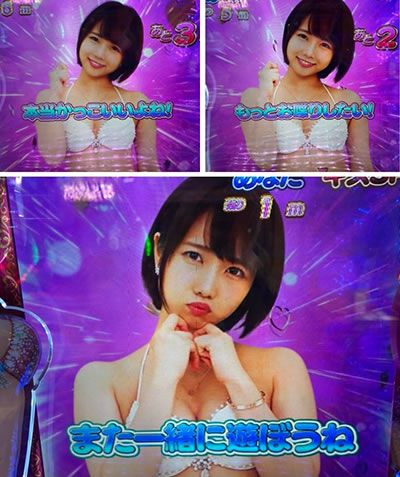 しばらく通常時を楽しんでいると、気になったのはキスチャレンジチャンスなる演出。推しの女優と対面し、距離が近づいたらキスSPリーチへ発展。ただ、これがなかなか当たらない。途中までは、かっこいいとか、もっと話したいとか、その気にさせるのに、最後は「また遊ぼうね」だって。もう腹が立って思わず「うん、遊ぼうね。」って返事しちゃたよ。