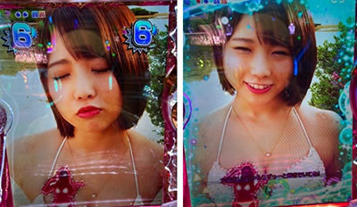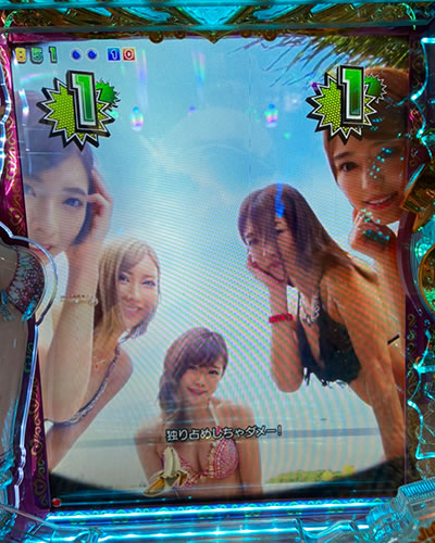 すると、打ち始めて早々に、アゲアゲスタンバイゾーンなるものに突入した後、7大胸アツ演出のハイハイ群と胸アツ演出が出現し、パーティSPへ。これが見事に大当り! ラウンド中の演出にも成功してSTゲット! わずか3000円でチャンスをものにした。が、これが100回転ノーリーチでスルー……。気を取り直して、通常時を打ち始めるとまたもや、追加投資1500円にてSTゲット! しかし、これまた100回転がノーリーチにてスルー。1/250は当たるのに1/83は当たらない。ツイているのかいないのかよく分からない展開ではあるが、とりあえず液晶では女の子達とワーキャーできているので単純に楽しい。持ち玉は大してないが、引き続き3回目の初当りを狙って打ち始める。