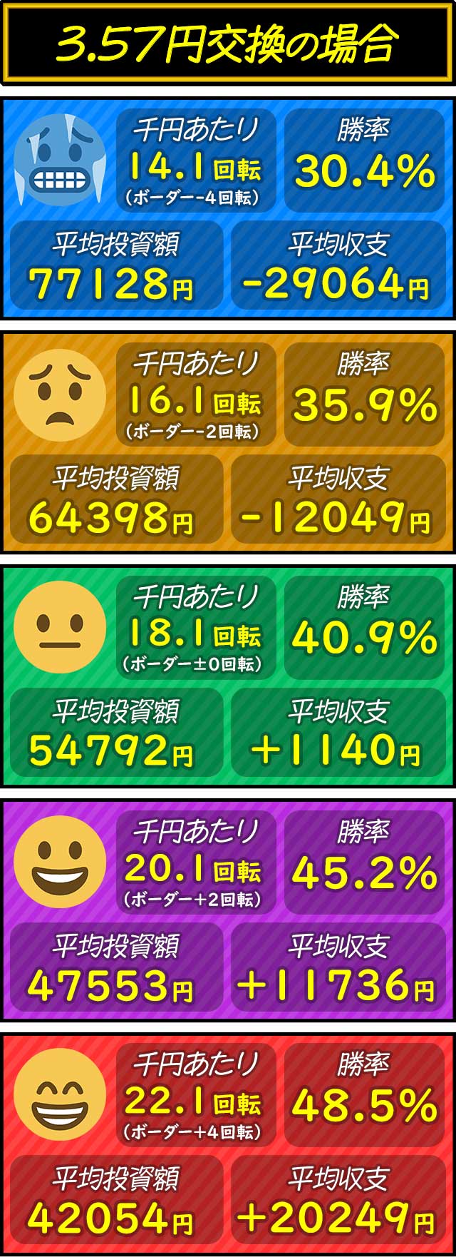 各交換率ごとにボーダー-4〜+4回転を5段階で分けた平均投資額・平均収支・平均勝率を紹介。打つ際の目安として参考にしてもらいたい。