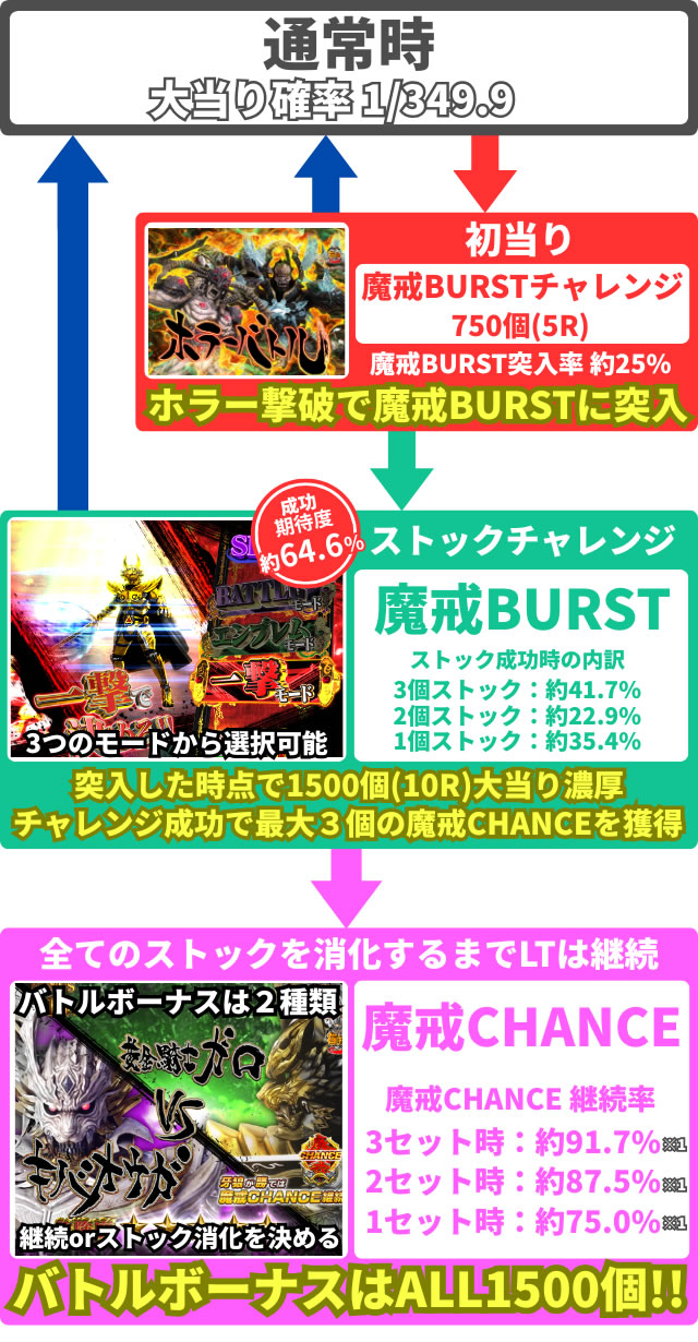 大当り確率は約1/349.9。初当り時はすべて750個獲得できる「魔戒BURSTチャレンジ」に突入する。ラウンド終了時のホラーバトルで勝利することが出来れば「魔戒BURST」へ突入だ。