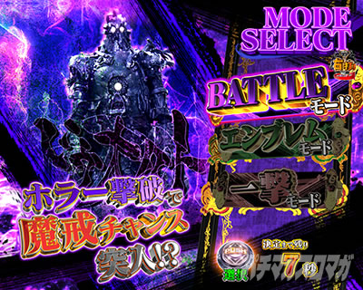 初当りの約25%で突入。3種類のモードから選択し、右打ち1回転で魔戒CHANCEのアイコンストックを目指す。演出成功なら1500個大当り+魔戒CHANCE(1~3個)をストック。 演出失敗なら1500個大当り獲得後に通常時に移行する。