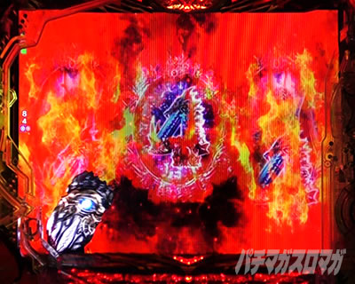 リーチ後に図柄が燃え上がる演出。炎の色が赤ならチャンス。