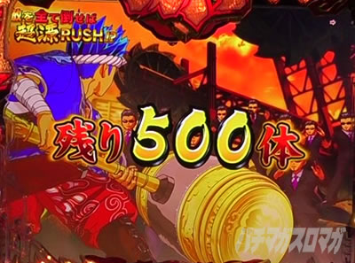 お馴染みのバトル告知は、敵を全て倒せばRUSH突入。 残っている敵の数が少ないほどチャンス。