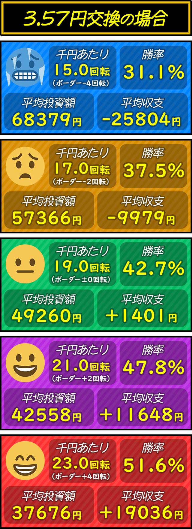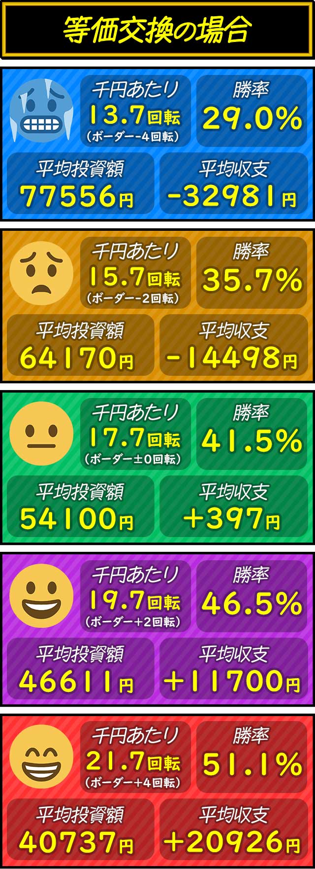 各交換率ごとにボーダー-4〜+4回転を5段階で分けた平均投資額・平均収支・平均勝率を紹介。打つ際の目安として参考にしてもらいたい。