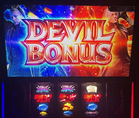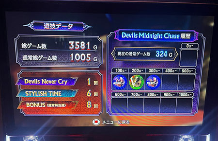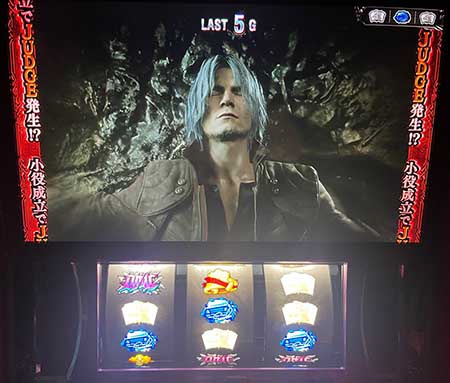 そして、上位STは懐かしのDMC。ボーナスは平均400枚払い出しで、15G間にリプレイ成立ならバージルジャック(50枚固定)、チャンス目成立ならダンテジャック(100〜1000枚)となります。あの5号機初期の枚数変動ボーナスがここで復活!!