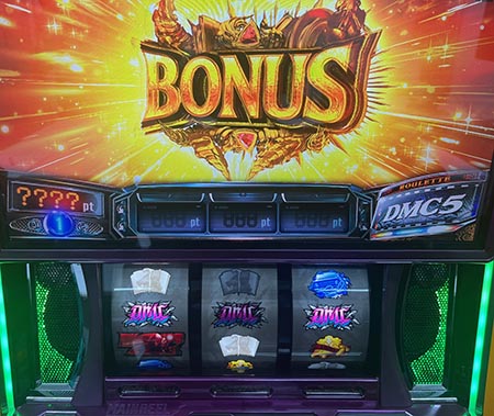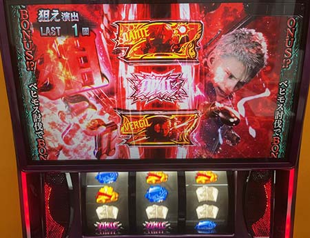 本機は左・中・右にDMC図柄があり、それが止まって小役が揃わなければチャンス目となっています。