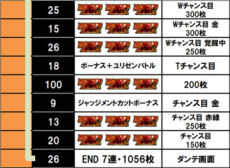 ダンテCZは期待度が70%と高く、さらに成功時はエピソードボーナス=STが確定。絶対に成功させなきゃならないやつですね。
