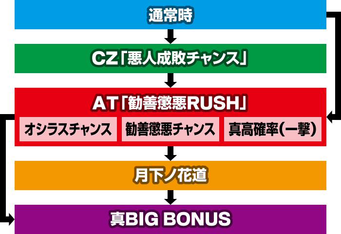 通常時は主に規定ポイント到達による周期抽選にてCZ「悪人成敗チャンス」を目指す。ポイントは倍化・特化ゾーンにて獲得ペースを早めることができる。