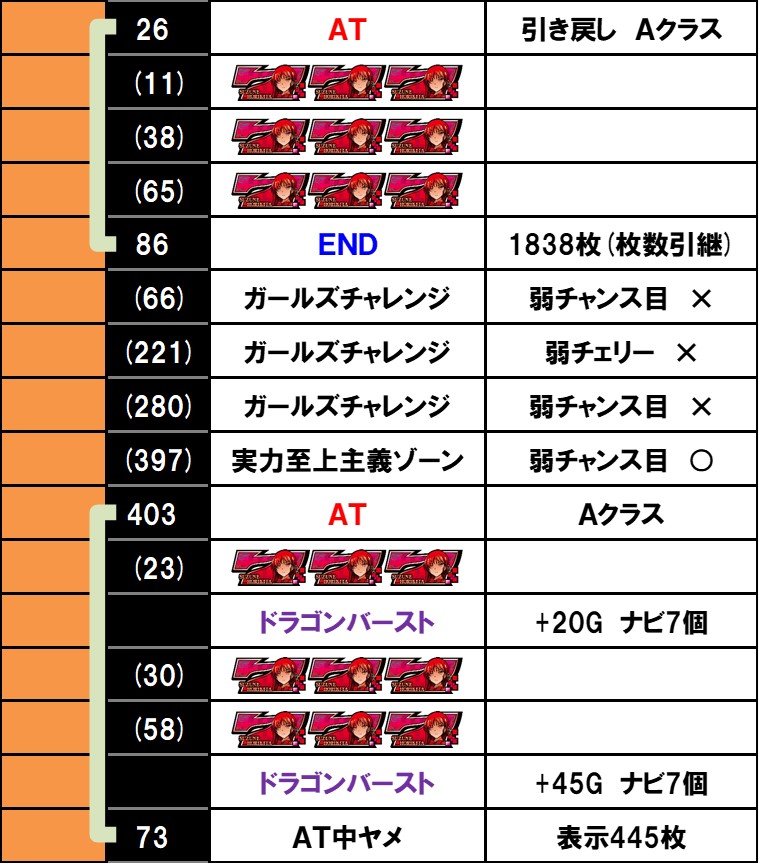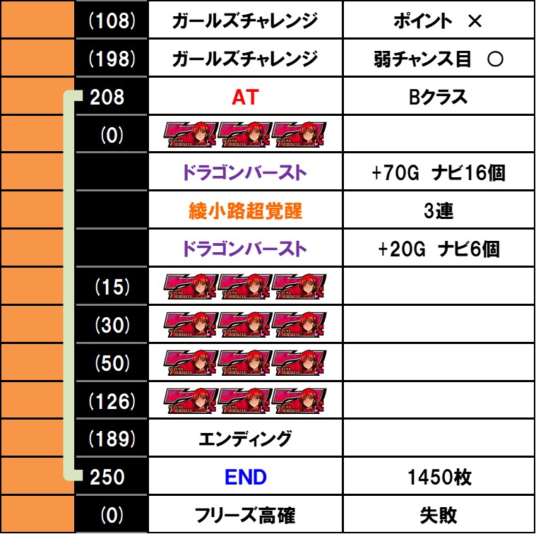 さらに、時系列を整理すると「中段チェリー⇒ドラゴンバースト3セット⇒ボーナス後に綾小路超覚醒」という流れでした。