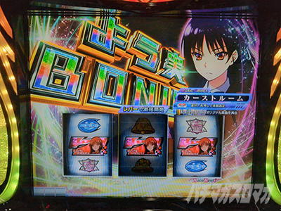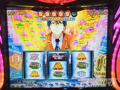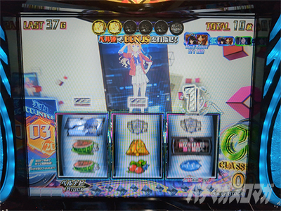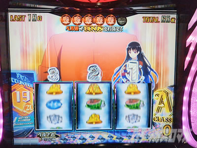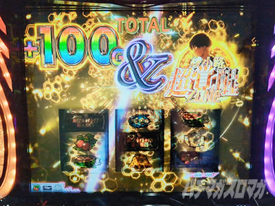 写真は見にくいですが、中段チェリーが降臨! 100Gの上乗せと、特化ゾーン「綾小路超覚醒ゾーン」を獲得!