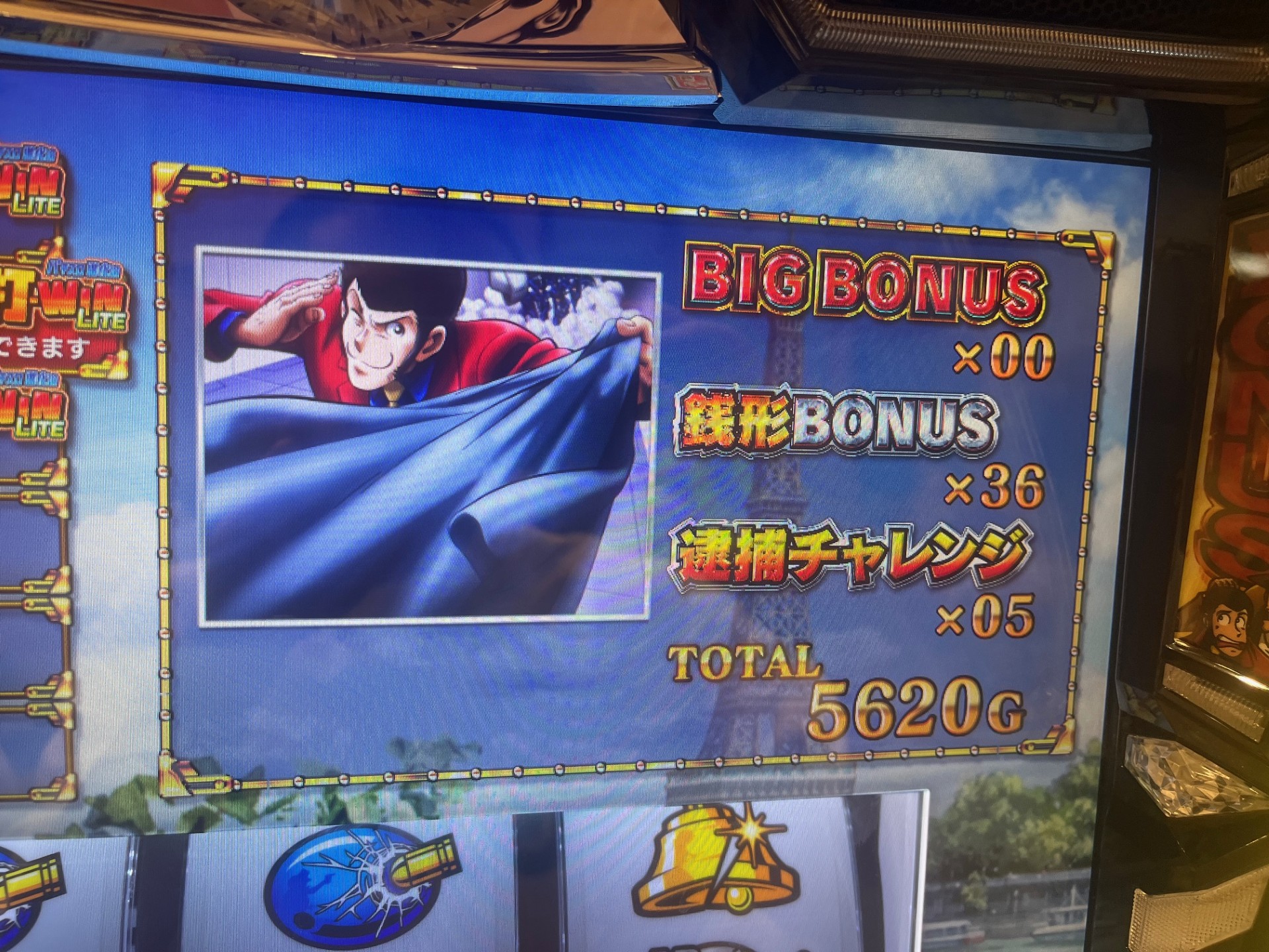 逮捕チャレンジはルパン・次元・五ェ門・不二子と消化していって、小役成立でボーナスのチャンス。それぞれ対応のレア小役であればボーナス確定。ゲーム数が短いのでレア小役を引くのは難しいものの、リプレイやプラムでも普通に当たるのが良いところ。
