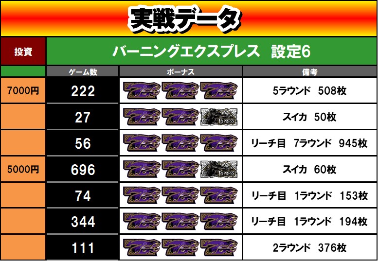 初当りのボーナス出現率は設定1以下となったのですが、バーニングエクスプレスボーナスのおかげで余裕の大勝ち!