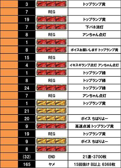 第1目標となるのが6連チャンでここで10%くらいは赤パトに昇格するらしい。そして10連チャンまで伸びたら赤パトが確定するので15連チャンさせて虹パトを目指す、というのがチバリヨ2プラスのゲーム性。