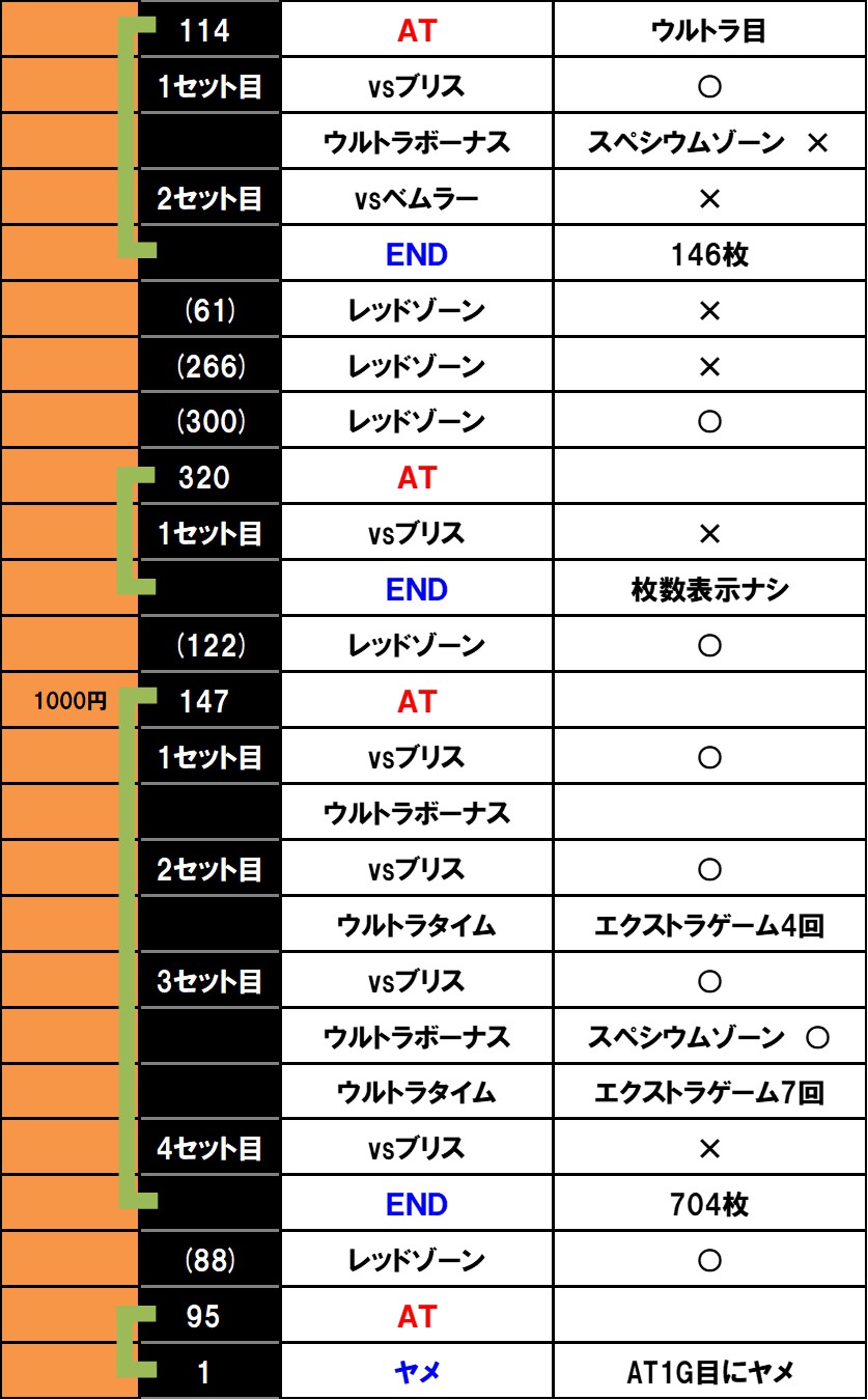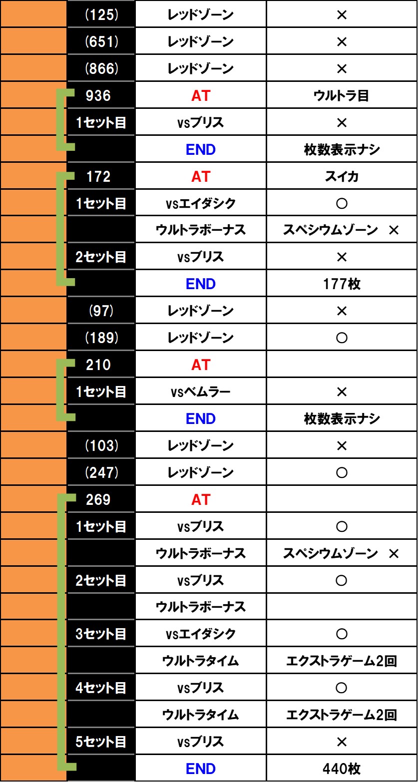 弱レア小役で内部状態を上げて、高確中のウルトラ目で当てるという流れが理想。とはいえ、低確中のウルトラ目でもAT当選にそこそこ期待できるようなバランスです。