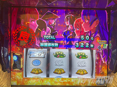 9回しか確認できていませんが、デフォルトが3回、高設定示唆(弱)が4回というのが気になるところ。ちなみに、隣でウドさんが打っていた設定5では高設定示唆(強)が頻発していました。