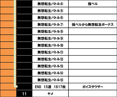 そして、このボーナスの3連目でなんと無想転生チャンスに当選し、弱チェリーを引いて見事成功。