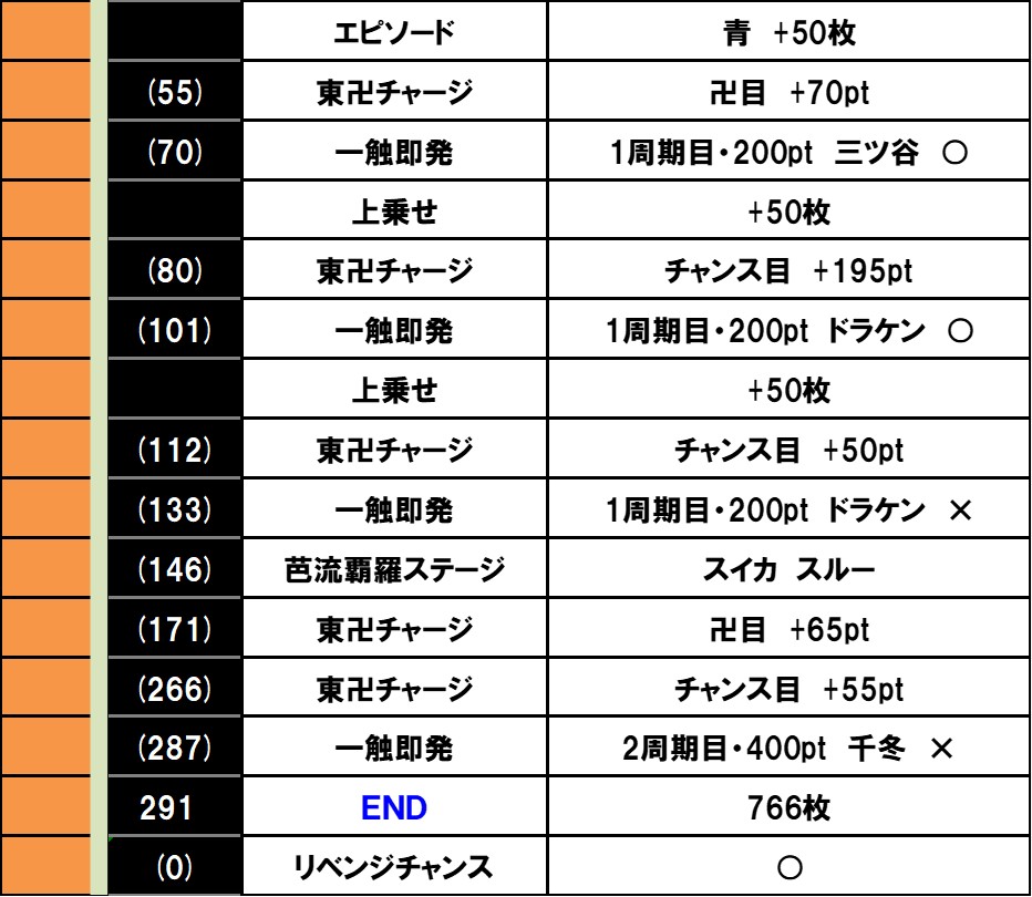 どうやら東卍アタック中のレア役成立時は差枚数の上乗せ抽選に加えて、進む先のマスをリベンジチャンスに昇格させる抽選を行っているようです。