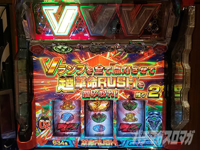 1セット継続するたびに筐体上部の「V」が点灯していき、3個点灯すると(つまり3セット目を突破すると)超革命RUSHへ昇格!