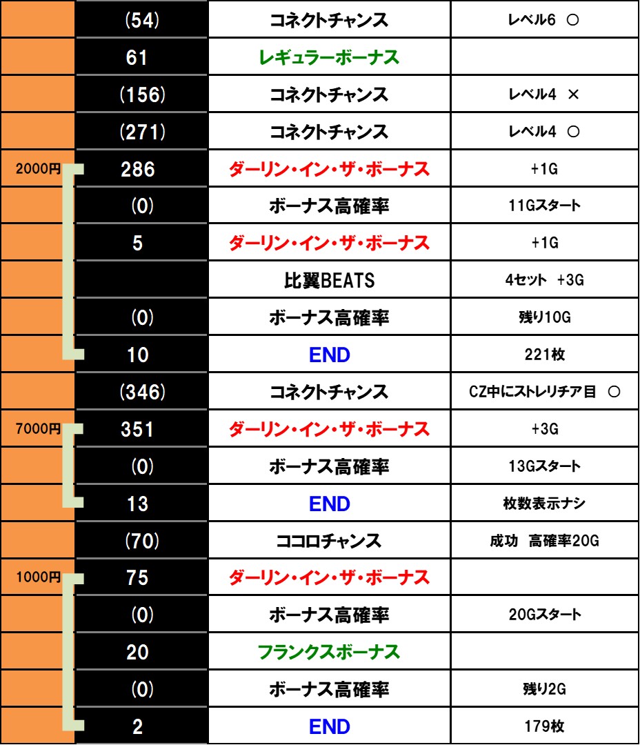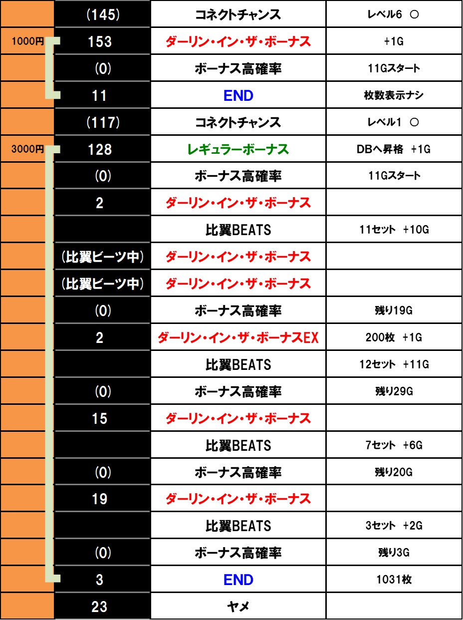普通の比翼BEATSによる高確率30G到達が王道ルートだとしたら、ダーリン・イン・ザ・ボーナスEXや連れ出し契機での爆発は裏道ルートといった感じですね。
