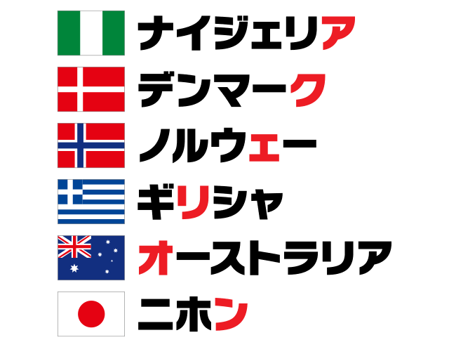 「えーっと、上から『オーストラリア』、『ギリシャ』、『日本』、『ノルウェー』、『デンマーク』、『ナイジェリア』の国旗ですね。」