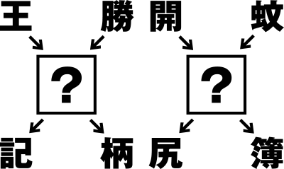 左のブロックは“手”(王手・勝手・手記・手柄)、右のブロックは“帳”(開帳・蚊帳・帳尻・帳簿)。よって答えは、“手帳”となる。